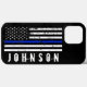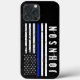 This unique phone case features a thin blue line police flag-themed flag in the centre in a rugged cracked and distressed style. To the side of this is a spot for your's or your gift recipient's unique first or last name.