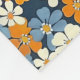 A vibrant floral pattern covers the entire image. Small, stylised flowers in shades of orange, light blue, and off-white are densely arranged on a navy blue background. The flowers have a slightly imperfect, painterly appearance, with variations in colour saturation and shape that give the pattern a textured, almost hand-painted look. The repeated pattern creates a cheerful and busy visual effect.