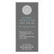 A rack card that's sure to get attention. A doily-like ornament draws the viewer into the center of this card using a clean type treatment that suggests a serene environment. A pretty turquoise is used on the back with the ornament repeated twice in a slight transparency over it. Perfect promotional card for a salon or spa, a massage therapist or wellness professional, or a retail shop focusing on gifts, apparel or accessories. Available in alternate colors with matching products.