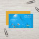 A modern stylish business card suitable for a deep sea diving instructor or diving business. This card features a cute illustration by Freepik of a diver underwater with tropical fish. Text can be fully customised to suit you needs. Blue and orange theme.