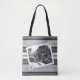 Create your own tote bag with your favourite cat photo . The background of the bag is a nice black and white striped pattern . There is a nice white frame with two edelweiss around the picture of your pet . Add some text if your wish to , or simply remove it .