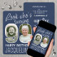 Look who's turning 90! Invite family and friends to an elegant 90th birthday celebration for him or her with custom 2 photo party invitations. Pictures and wording on this template are simple to personalise. The navy blue and white colours for the background, text and number outlines can all be customised by using the Zazzle design tool. (IMAGE PLACEMENT TIP: An easy way to position a photo exactly how you want is to crop it before uploading to the Zazzle website. If you need additional help, please message me :) The design features two pictures of your choice, modern script calligraphy, and stylish vintage art deco typography. The unique gender neutral design is also suitable for either a man or a woman. Happy Ninetieth Birthday!