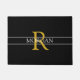 Personalise this trendy black doormat with Gold Monogram and White Name. A simple, yet elegant design for him or her with 2 grey stripes.
