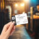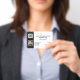 A plain black horizontal badge forms a border edge to the left side of this card and has a template for your logo, company barcode and employee photo on it. The front right and back of the card have templates for your company name; employee details and business address. Personalise the template to suit your requirements and change the background and font colour to any of your personal choice.