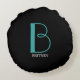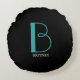 DIY Large Monogram & Name, Teal/White Text, Black Round Cushion