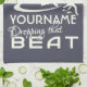 "DJ [YOURNAME] dropping that beat". Change the text field to what you want. Using the "customise it" function, you can also change (edit) the background colour of this item, as well as add more text if you wish. See my store for more items with this design.