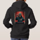 Retro postage stamp of a hooded skeleton DJ with a skull face, hands raised in the air, red spotlight background, jagged stamp border, distressed vintage style, bold red and black tones.