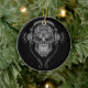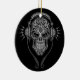 An elaborate DJ sugar skull design decorated with intricate swirls and dot patterns. Headphones sit on top of the skull with two wires hanging below. The complex lines and circles are solid black while the interior of the skull is finished with highlighted shades of gray. Music blasts out of the headphones in the form of gray lightning bolts and the pure black background. This aggressive Day of the Dead inspired image makes a striking ornament