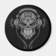 An elaborate DJ sugar skull design decorated with intricate swirls and dot patterns. Headphones sit on top of the skull with two wires hanging below. The complex lines and circles are solid black while the interior of the skull is finished with highlighted shades of gray. Music blasts out of the headphones in the form of gray lightning bolts and the pure black background. This aggressive Day of the Dead inspired image makes a striking magnet