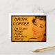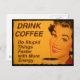 Smiling woman with retro red lipstick and nails drinks her cup of morning coffee. The caption reads "Drink Coffee - Do Stupid Things Faster with More Energy."