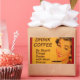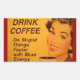 Smiling woman with retro red lipstick and nails drinks her cup of morning coffee. The caption reads "Drink Coffee - Do Stupid Things Faster with More Energy."
