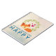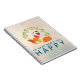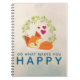 A spiral notebook with a cartoon drawing of a cute orange fox sleeping peacefully with little red hearts hovering around. A green foliage wreath behind. Text says: "Do what makes you happy". A grunge-y cream coloured background with a trendy faint pattern of geometric shapes.