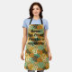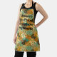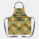 This apron has a mid-century modern design of a record adapter overlapping all over in tan, off-white, brown, orange, turquoise, blue, and green.