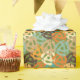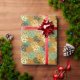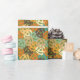This wrapping paper has a mid-century modern design of a record adapter overlapping all over in tan, off-white, brown, orange, turquoise, blue, and green.
