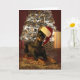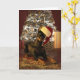 A cute Christmas scene of a Doberman dog wearing a Santa hat.