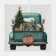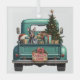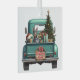 A teal blue retro pickup truck carries a decorated Holiday tree and gift packages on this cute glass Christmas ornament. Looking out from the tailgate is a beautiful Doberman Pinscher Dog. A Santa Claus hat sits on one of the gift packages, and a rustic wooden sign on the back bumper says "Christmas Cheer".