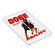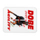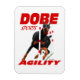 An energetic black Dobermann in the weave poles with the Dobe Sports logo on a flexible photo magnet.