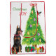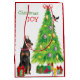 On each side of this Holiday gift bag, a Doberman Pinscher Dog wears a red bandanna scarf while he sits beside a Holiday tree. Around the dog brightly wrapped gift packages are scattered about. A bullfinch is landing on the Christmas tree. The red and green text says "Christmas JOY".