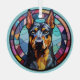 Here's a pretty glass ornament with a stained glass theme, featuring a beautiful Doberman Pinscher dog. The dog is set against a multi colour mosaic background. Colours include blue, gold, maroon red, and lavender pink. This makes a nice stocking stuffer or decoration for the household who loves a majestic Doberman.