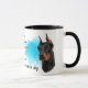 A beautiful portrait of a black and tan Doberman Pinscher Dog is the feature on two sides of this mug. Each image is placed on a bright blue spatter background. Between the two images is the text that describes this loyal and courageous companion, with "the DOBERMAN PINSCHER dog" in black at the bottom. All the text is easily customised to anything you'd prefer; describe your own loyal friend!