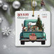 A teal blue retro pickup truck carries a decorated Holiday tree and gift packages on this cute ceramic Christmas ornament. Looking out from the tailgate is a beautiful Doberman Pinscher dog. A rustic wooden sign on the back bumper says "Christmas Cheer". The red and green stylised text at the top left says "MERRY CHRISTMAS", with your name (or your dog's) and the year at the right. Both sides have the same image.
