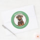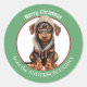 An image of an adorable black and tan Doberman Pinscher puppy dog wearing a winter hat is at the centre of this Holiday sticker. The image is framed in a circular green border which contains your custom text in white. Cute for Christmas cards, correspondence, and gift packages.