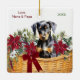 Here's a pretty Holiday ornament that would make a great gift for a grandchild, son, daughter, or anyone. Both sides of the ornament have an image of a basket of red poinsettia blossoms, white flowers, and pine bough sprigs. In the middle sits an adorable Doberman Pinscher puppy. The wicker basket is decorated with a red bow. The front has green and red text that says "Merry Christmas, and a name. The back has your signature and the year.