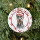 On the front of this Holiday ornament is a beautiful watercolor image of a Doberman Pinscher wearing a red and white striped Santa hat. The image is placed on a white circle framed by a retro red snowflake pattern. The back of the ornament has the same background and circle with your custom text in white on a matching red background. Cute, especially for someone who loves a Dobie.