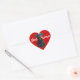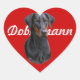 A black Dobermann Pinscher with natural ears (uncropped) on a heart shaped sticker with breed name behind it.