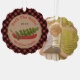 Illustration of a red canoe decorated with Christmas lights with Christmas tree inside. Background is brown cardstock with red and black buffalo plaid border. Personalise the text. Personalise the photo on back.
