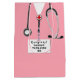 Doctor graduation gift bag featuring pink hospital scrubs and stethoscope art. Edit text to add doctor, physician assistant or nurse grad's name.