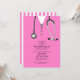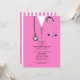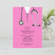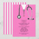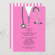 Creative medical school graduation party invites featuring pink hospital scrubs and stethoscope. Edit text to create unique doctor party invitation or medical school grad announcement.