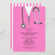 Creative doctor graduation party invites featuring pink hospital scrubs and stethoscope. Edit text to create unique doctor party invitation or medical school grad announcement.