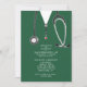 Creative medical school graduation party invites featuring green hospital scrubs and stethoscope. Edit text to create unique doctor party invitation.