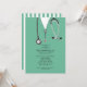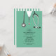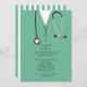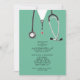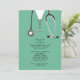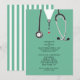 Creative medical school graduation party invites featuring hospital scrubs and stethoscope. Edit text to create unique doctor party invitation.
