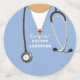 Creative healthcare party decoration for doctor or medical school grad celebration featuring blue hospital scrubs and stethoscope. To personalise edit text to add name of physician.