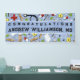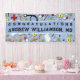 Creative medical school graduation banner featuring healthcare supplies and flowers pattern on blue background. To personalise edit text to add name of physician.