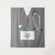 Creative doctor graduation photo backdrop and party decor featuring grey hospital scrubs design for medical school grad event or celebration. Edit text to add physician's name and his or her medical credentials.