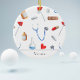 Great personalised ornament for doctors, nurses and other health worker as well as for medical students or just graduated. With a beautiful hand drawn pattern of medical equipment, this keepsake will be perfect for your Christmas tree. The illustration consists in bottles, pills, adhesive bandages, blue stethoscopes, red reflex hammers and pills among other designs. This pattern has very bright colours that contrast with the white background. At the bottom of the ornament there is a grey line to separate the text. Personalise the text with your own message and click on customise further if necessary. Illustrated and designed by Patricia Alvarez.