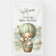 Adventure themed baby shower, vertical Welcome banner with an adorable white and tan puppy holding a teddy bear riding in a green hot air balloon. The watercolor green sky has white clouds with surrounding gold stars. Template included.
