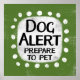 An irreverent and cute typographic animal design that says "Dog Alert, Prepare To Pet". It features black and red text on a white rectangle with funky, playful white dots surrounding it, all on a grey background.