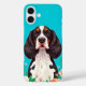 Colourful illustration of a dog against a bright blue background. The dog has a distinctive black and white coat with long ears and is surrounded by various flowers in shades of pink, yellow, and blue.
