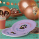 A puppy paw print covered with confetti and streamers. Custom paper plates for parties.
