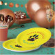 A puppy paw print covered with confetti and streamers. Custom paper plates for parties.