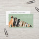 A pet care services next appointment business card. Perfect for a dog walker, boarder, dog sitter or doggie day care. On a green background, watercolor images of ten dogs including a great dane, boxer, labrador, beagle, bull dog, pomeranian, beagle, dachshund and terrier, are displayed from big to little. Personalize by adding your business and contact details to the front and back.