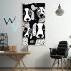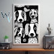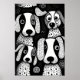 A black and white pattern with little dogs in the background, in the style of pop art illustration, surrealistic cartoons, digitally enhanced, expressive faces, mosaic forms.