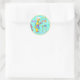 “A surprise for dinner” features the Chef Dog fixing a surprise, a bone wrapped with a candle, ready to serve. On the front of the invitation, Chef Dog’s expression shows pride while serving the surprise. Fuchsia wrapping paper leans against the wall. Pots and pans hang on the wall with a purple bone shaped clock. The background is turquoise with green paw prints and has a yellow border with blue dots.