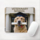 A golden retriever wears a graduation cap and holds a diploma in its mouth, standing in front of a building labelled "Veterinarian School"