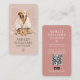 Modern, elegant and stylish dog groomer business card with qr code. Design featuring your name and title ,watercolor dog in a robe icon with floral elements on a blush background on the front. Personalise further with your contact details, qr code and social media details on the back. Perfect for pet grooming business.