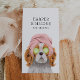 Cute business card designed for dog groomers featuring an illustration of a Charles King Spaniel dog getting a spa treatment with cucumber slices and with pink headband.